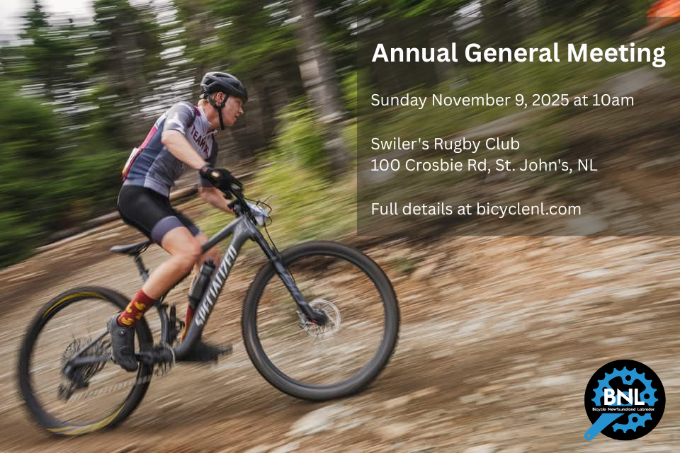 You are invited to attend the 2025 Bicycle Newfoundland and Labrador Annual General Meeting (AGM). Members will again be able to attend this year's meeting live in person @ the Swiler's Rugby Club (Address: 100 Crosbie Rd, St. John's, NL A1B 1E8) on Sunday November 9, 2025 at 10am  and online via Google Meet.